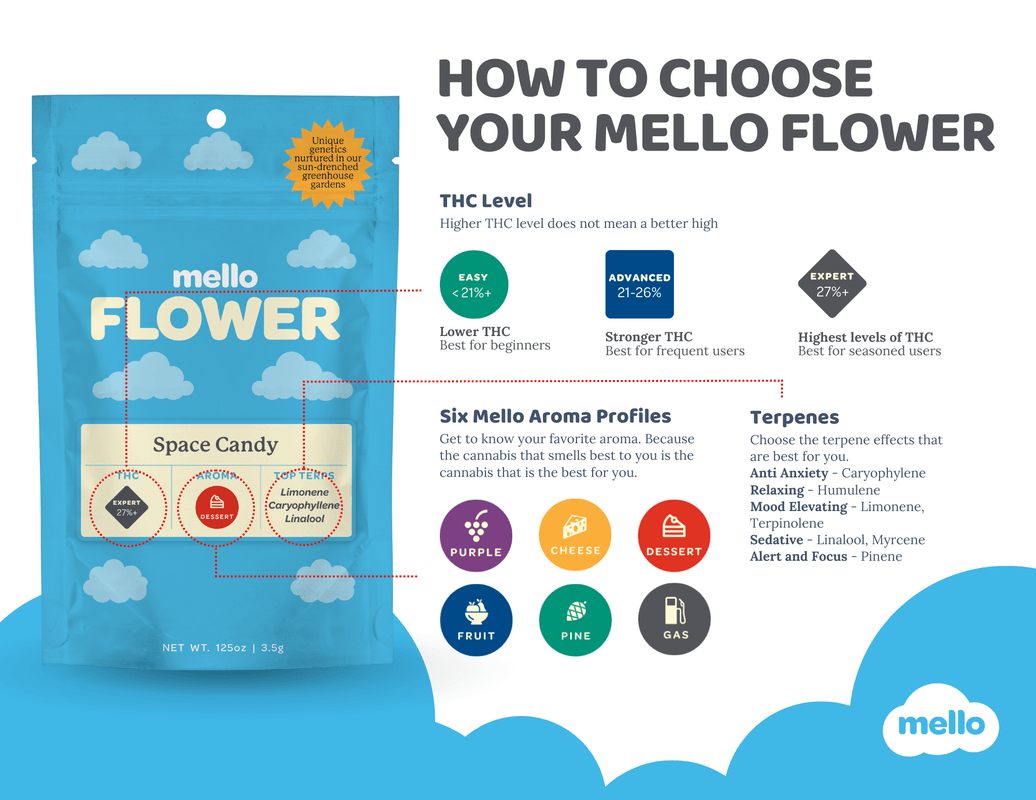 When you choose your Mello Flower, pay attention to these terpenes. If you want to unwind after a long day, go for sedative or relaxing strains. If you need focus or a mood boost, try alert or mood-elevating options.